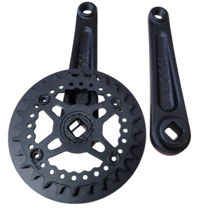WOOM EXPLORE/NOW 5 - 28T 130mm black square taper Aluminum alloy, ~450g, with chain guard, square taper. Fits all WOOM models in sizes 4-5, although ORIGINAL/OFF/UP models originally have silver ones.