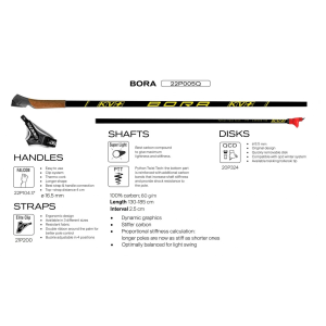 100% carbon shaft, proportional stiffness (pikemad kepid sama jäigad kui lühemad), 16.5/8.5 mm läbimõõdud, kerge ja tasakaalus hoogne liikumine. QCD 8.5 mm kulbid – külma- ja löögikindlad, sobivad eri lumetingimustesse; kiirelt eemaldatavad. Falcon clip handle – termokork, pikem kuju, parim ühendus rihmaga. Elite clip strap – ergonoomiline, vastupidav, kolm suurust, parem kepikontroll tänu topeltlindile peopesa all.