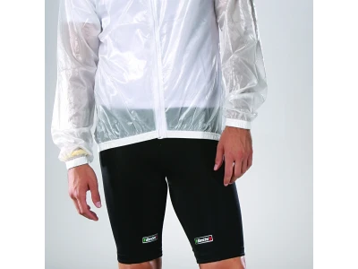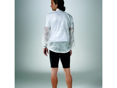 The Superlight and pocketable jacket. Made of breathable 100% polyester fabric. Longer on the back, velcro fastening. Packaging of fabric bag.